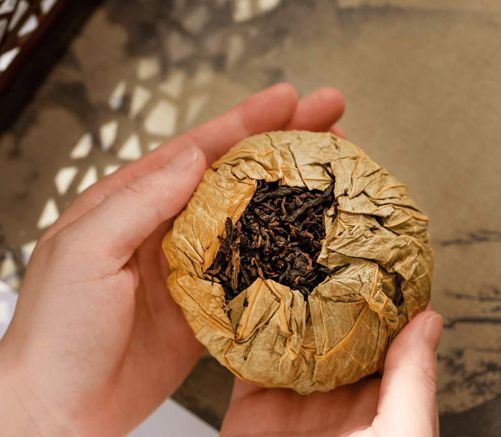 茶坯于今年开仓,用新鲜采摘下的荷叶包裹茶坯,慢火精焙整整25日左右,整个流程把控很严格,需要每日多次查看焙茶情况,严格把控茶团水分。