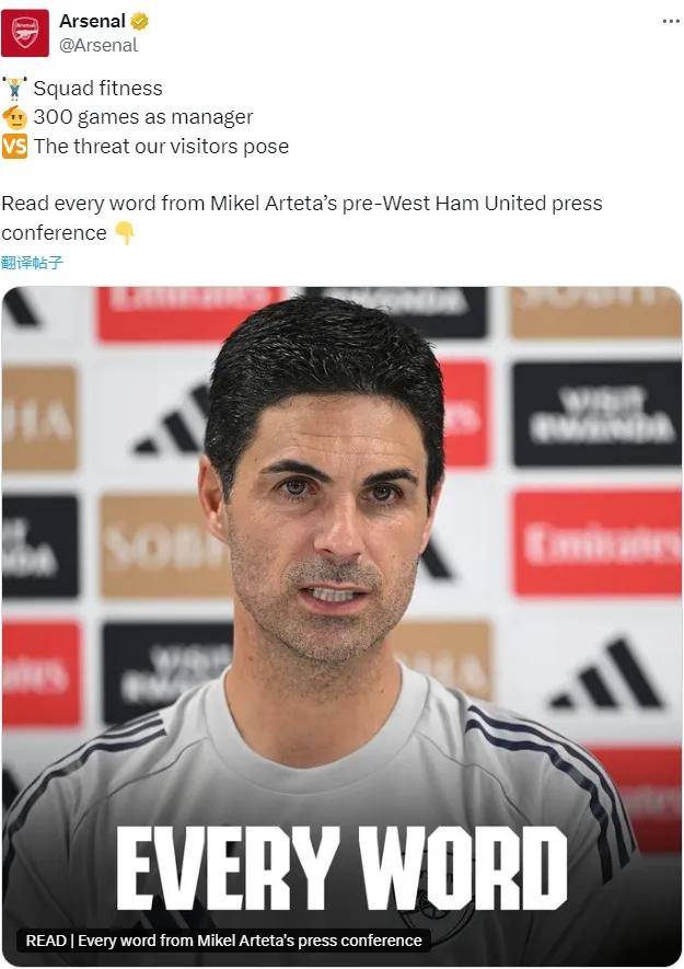 记者还提到,阿尔特塔的胜率已是阿森纳历史最佳(或许是指胜率),询问他是否为此感到自豪。阿尔特塔回应道:“继续努力,最重要的就是保持状态,做好接下来的比赛。”