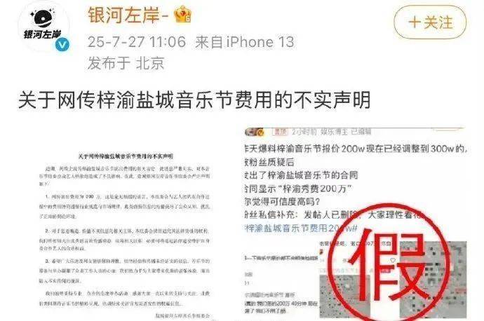 虽然之后银河左岸(梓渝所在公司)出来辟谣,否认梓渝在音乐节出场费200w,还说支持晒合同,但从舆论风向看,吃瓜网友对贵圈的各种声明好像都脱敏了,都在问200w不实的话,那是比这个高还是比这个低?
